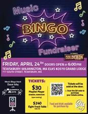 Get ready for a fun night out! Join us for Music Bingo, a high-energy fundraiser to benefit Soldier On and the veterans we serve in Tewksbury! ?? Date: Friday, April 24 Doors open: 6:00 PM Tickets: Sold at the door and Online -?? Grab your tickets here (https://web.charityengine.net/elksmusicbingo) Pricing:$30 General Admission or $240 Eight-Track Table (table of 8) Food & drink: Available for purchase. |