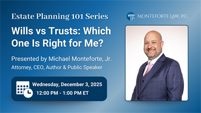 Join experienced elder law and estate planning lawyer Michael Monteforte, Jr., CEO of Monteforte Law, as he covers everything you need to get started with estate planning. Learn which estate planning problems wills and trusts can address, how to navigate the estate planning process and associated costs, and how estate planning and long-term care intersect. You’ll leave knowing: